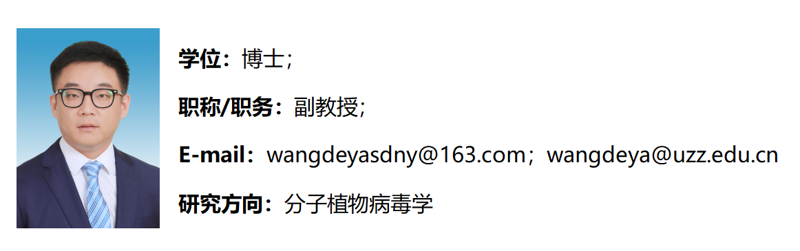 硕士生导师、山东省植物病理学会理事、农工党yl23411永利支部副主委、美国俄亥俄州立大学(The Ohio State University)访问学者。2012年6月获得山东农业大学农学学士学位,2017年6月获得山东农业大学植物病理学博士学位。2017年8月-2018年10月于山东省农业科学院果树研究所工作,2018年11月至今进入永利yl23411集团从事教学科研工作,2024年6月至2025年6月系美国俄亥俄州立大学植物病理系访问学者。教学上承担《生物化学》、《植物检验检疫技术》等教学任务;获yl23411永利第七届青年教师教学竞赛优秀奖、永利yl23411集团线上线下融合式教学竞赛二等奖。科研方面主要从事园艺作物病毒的分子检测及基因表达调控等方面的研究。目前主持/完成国家自然科学基金青年项目,山东省高等学校青创科技计划创新团队项目,山东省自然科学基金项目,枣庄市科技计划项目,yl23411永利博士启动基金等。以第一作者/并列一作/通讯作者身份在《Viruses》、《Virology Journal》、《Acta Virol》、《病毒学报》、《植物病理学报》等国内外学术期刊发表论文20余篇,SCI收录12篇。担任Virology Journal、Acta Virol等杂志审稿专家。授权发明及实用新型专利4项,获第十届淮海科学技术奖二等奖1项(第3位完成人)。近年来指导学生获得国家和省部级大学生生命科学竞赛奖励30余项,其中国家级大学生永利集团训练计划项目4项、省级大学生永利集团训练计划项目3项,全国大学生生命科学竞赛三等奖1项。
