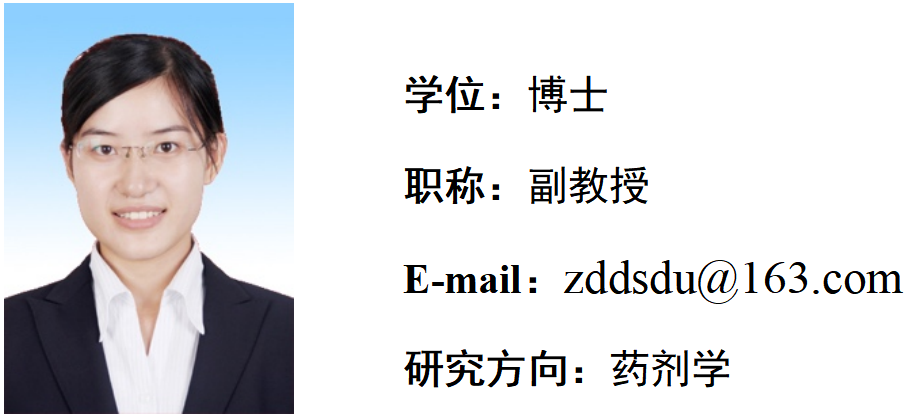 毕业于山东大学药剂学专业,获医学博士学位。主要从事新型给药系统、药代动力学与生物药剂学研究。主讲课程有《药剂学》、《工业药物分析》、《蛋白质结构与功能》等。主持山东省重点研发计划项目、山东省自然科学基金项目各1项。近年来以第一作者或通讯作者身份在《International Journal of Pharmaceutics》、《Cancer Letters》、《Drug Delivery》、《Current Drug Metabolism》、《International Immunopharmacology》、《Journal of Drug Delivery Science and Technology》等SCI期刊发表论文多篇,授权发明专利2项。