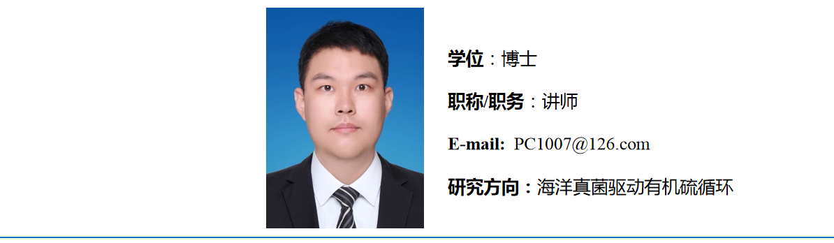 中共党员,2023年12月毕业于南京大学生物学专业,获理学博士学位。2024年6月进入永利yl23411集团工作。主要从事海洋真菌驱动有机硫循环的相关研究。近年来以第一作者身份在《Science of The Total Environment》、《iScience》、《BMC genomics》、《Frontiers in Microbiology》等学术期刊上发表论文多篇。