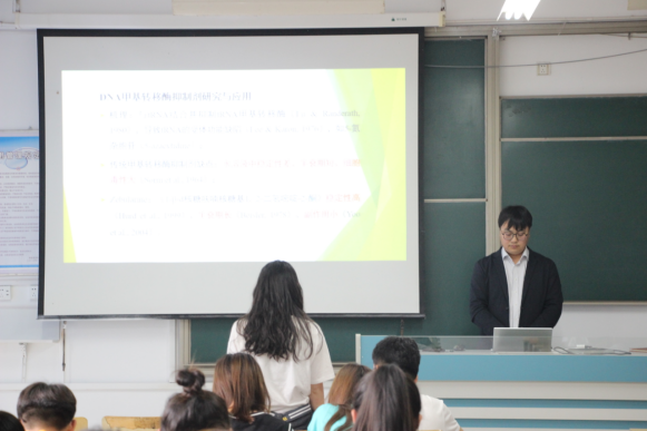 马旭辉博士从八倍体小黑麦的人工合成、染色体变异的诱发与鉴定、变异染色体的遗传效应三个方面向学生介绍了植物多倍体的优缺点,探讨了小麦人工多倍体的加倍方法、改良方法、化学诱变对植物染色体的诱变效应、诱变后代对表型性状的影响等问题,并对多倍体的遗传特征等专业知识进行了详细的讲解。
