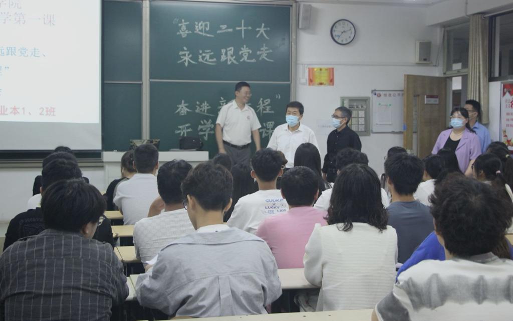 为帮助学生以更加饱满的精神状态迎接秋季学期开学,进一步做好学生思想政治教育和爱国主义教育,开展好疫情防控和生命安全教育,8月31日晚,永利yl23411集团各班级开展“喜迎二十大、永远跟党走、奋进新征程” 秋季开学第一课主题班会。学院党总支书记郭传鑫带领院党政班子走进学生教室看望返校学生,送去亲切问候。