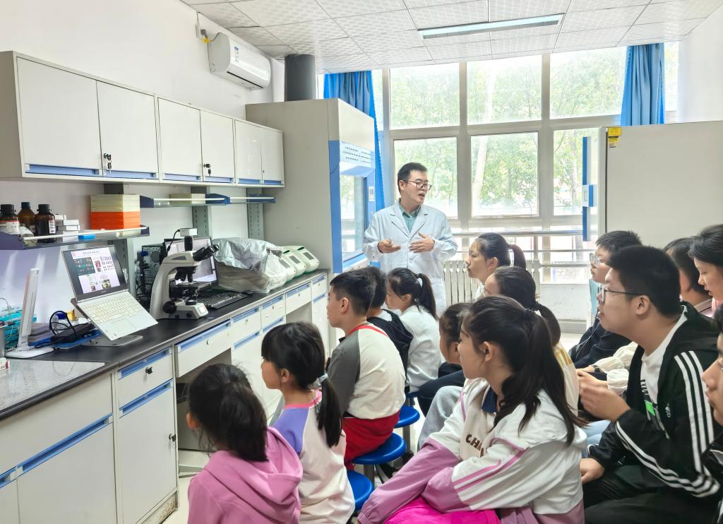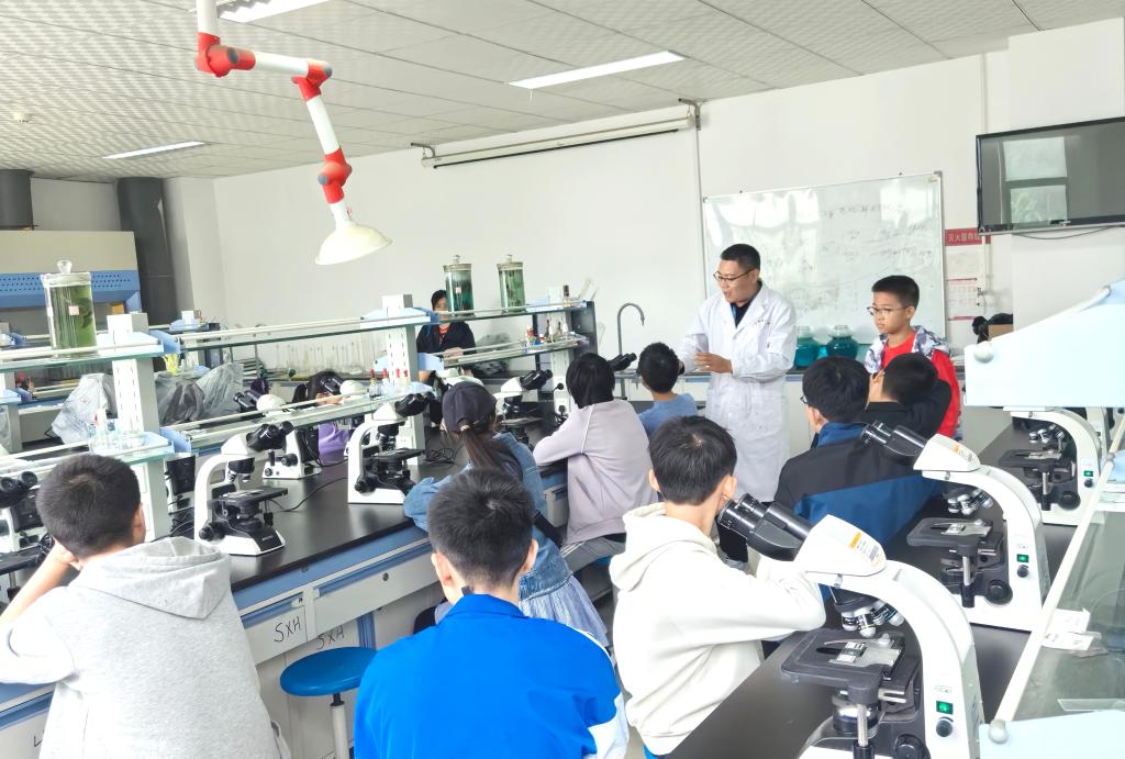 在生物实验楼,同学们近距离感受标准化的实验室、了解严谨的实验操作和精密的仪器设备。在生物标本馆,指导教师李晓红详细地向学生们介绍了各类琳琅满目的生物标本,详细阐述了这些生物的特点、生活习性以及它们在生态系统中的重要角色,使学生们对生命的多样性和复杂性有了更为直观的认识;在教学技能实训室,指导教师朱天顺向同学们讲解了显微镜的构造、操作,并指导大家观看各种动植物组织切片,体验了微观世界的美妙;王宏晋老师则为学生们带来一场题为《生物的遗传与变异》的精彩课程,通过生动有趣的案例、深入浅出的理论解析及最新的科研成果,向学生们介绍了基因克隆的原理及方法,感受未知的神奇生命现象。
