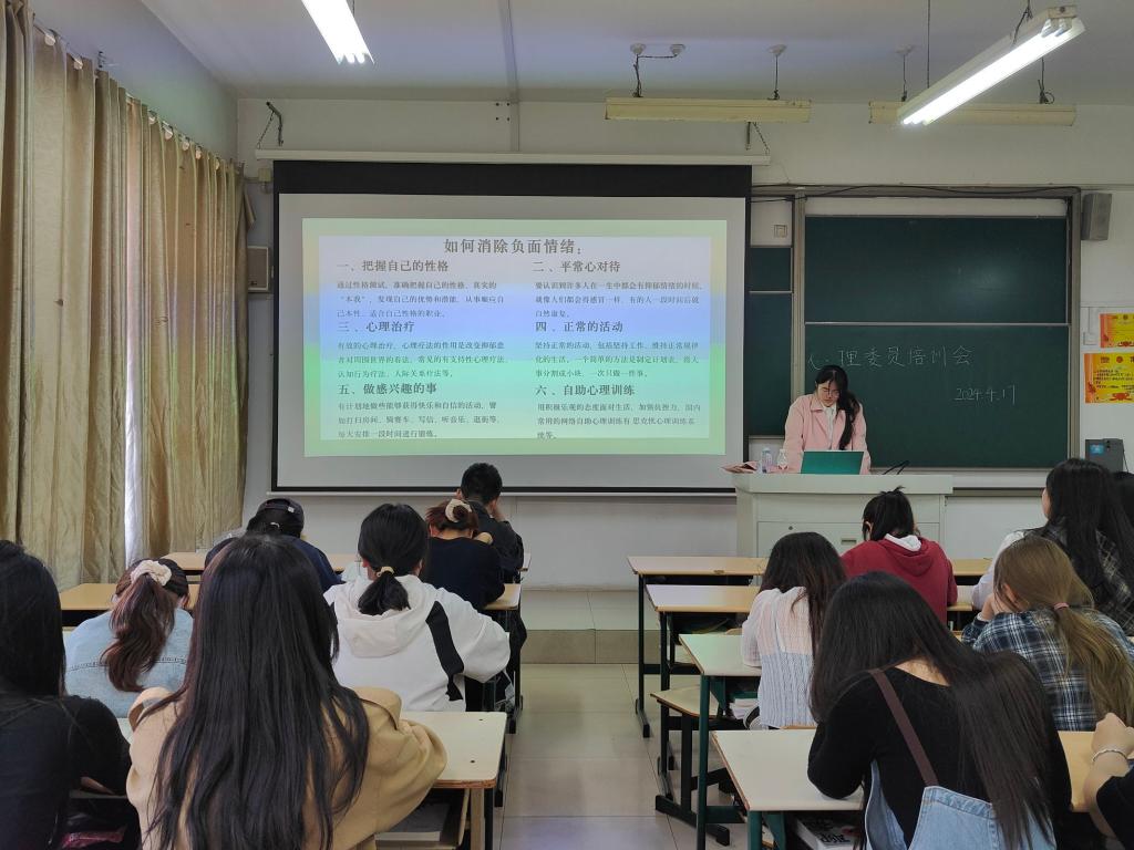 本次会议包括心理健康的标准、抑郁性心理问题、负面情绪的危害、如何消除负面情绪四个部分。最后着重讲述了如何消除负面情绪。唐文婷首先让大家详细了解了大学生心理健康的标准,各位同学结合自己状态有一个相对正确的认知。其次介绍了大学生可能存在的抑郁性心理问题的表现,让大家分的清楚负面情绪,最后了解负面情绪的危害,最后着重讲了如何消除负面情绪。