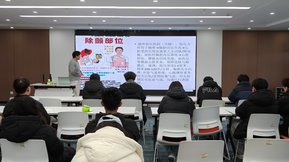 本次活动聚焦常见应急情境,王福源结合理论讲解与实际操作演示,为在场同学带来了一场生动而实用的急救知识课。内容紧扣生活实际,重点围绕心肺复苏(CPR)的操作流程、自动体外除颤器(AED)的使用方法、气道异物梗阻的海姆立克急救法、常见外伤的止血与包扎技巧以及突发晕厥、中暑、触电等意外情况的初步应对措施展开。讲解深入浅出,语言通俗易懂,确保了知识的有效传达。